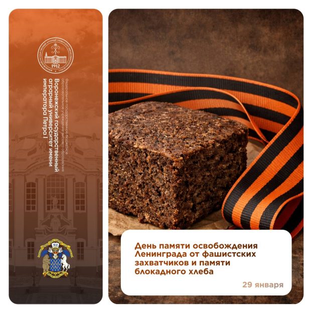 29-го января наш университет присоединится к Всероссийской акции памяти. В Юбилейном зале ВГАУ пройдут мероприятия, посвященные символу стойкости и мужества — блокадному хлебу. Мы вспомним о дне полного освобождения Ленинграда от фашистской блокады и почтим память его защитников и жителей.